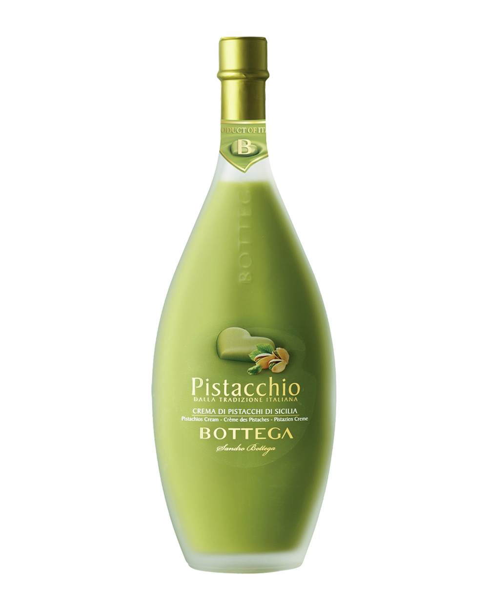 It is a creamy liqueur, pleasantly sweet and with a moderate alcohol content, characterized by an intense aroma of pistachio. Pistachios are the fruit of a plant native of the Middle East, now growing spontaneously on the Sicilian volcano Mount Etna. They have always been renowned for their nutritional properties. Pistachios, exclusively harvested in Sicily, are processed according to a traditional method and turned into a paste which preserves all their precious organoleptic characteristics. The paste is then expertly mixed with alcohol, water and sugar, creating a creamy, round, velvety liqueur with an intense an inebriating aroma of Sicilian pistachios. With a final touch of grappa, Pistacchio Bottega gains a particular aromaticity, making it unique and unmistakable.