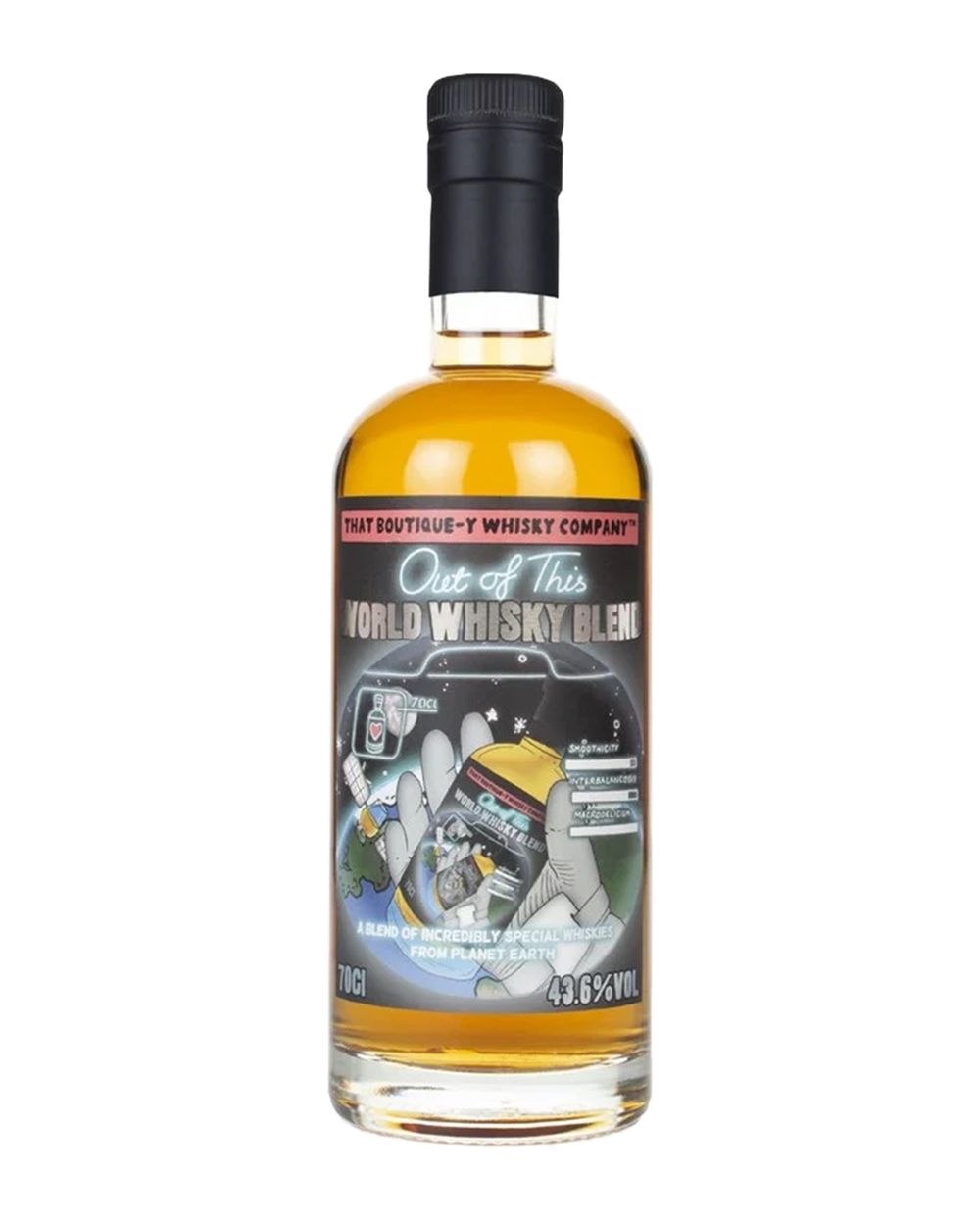 Creative, vibrant, and utterly unconventional, the Out of This World Whisky Blend from That Boutique-y Whisky Company is a blended whisky designed to surprise, delight, and defy gravity. Built from whiskies sourced from across the globe (and maybe even beyond), this dram offers a flavour experience that’s playful yet well-crafted — a whisky with both personality and punch. On the nose, it launches with notes of tropical fruit salad, toffee popcorn, and cereal malt, layered with hints of coconut cream, ripe banana, and orange zest. There’s a subtle swirl of vanilla spice, fresh herbs, and just a touch of outer-orbital funk — think light rancio or oxidised sherry. The palate is rich and layered, with flavours of honeycomb, baked pineapple, dark chocolate nibs, and grilled stone fruits. Beneath the fruity burst lies a structure of biscuit malt, oak tannin, and warming cinnamon. Elements of both malt and grain whisky are clearly present, and possibly even a whisper of smoke — like a distant signal from Islay or a rogue rye. The finish is long and evolving, fading through spiced caramel, dried papaya, sweet tea, and light tobacco leaf. It leaves the palate gently glowing with warmth and curiosity.