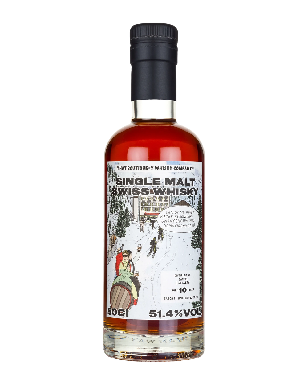 Bold, alpine, and wonderfully unconventional, the Säntis 10 Year Old from That Boutique-y Whisky Company is a captivating Swiss single malt matured in historic oak beer casks — a hallmark of the Appenzell-based distillery. After a decade of ageing, it offers a whisky that is distinctly malty, slightly wild, and full of character born from its unique cask heritage and high-altitude terroir. On the nose, it reveals deep aromas of dark malt, roasted nuts, and spiced fruit compote, intertwined with notes of leather, treacle, and a hint of dried hops. A subtle waft of smoke or burnt caramel may linger, evoking echoes of the cask’s previous life. The palate is rich and textured, offering a tapestry of toasted cereal, coffee grounds, fig jam, and oak spice. The beer cask influence imparts a robust umami depth — think dark rye bread, hazelnut, and spiced ginger cake. A background of earthy tannin and dried herbs creates structure and length The finish is long and slightly dry, with lasting impressions of cocoa nibs, clove, sandalwood, and a soft, resinous bitterness — reminiscent of the last sip of a barrel-aged stout.